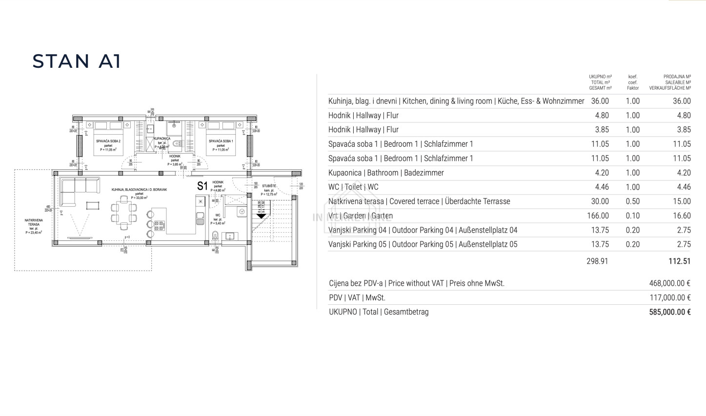 In ruhiger Lage in Sukošan wird eine moderne und luxuriöse Erdgeschosswohnung in einem hochwertig gebauten Mehrfamilienhaus mit nur drei Wohneinheiten zum Verkauf angeboten – jede auf einer eigenen Etage, was zusätzliche Privatsphäre und Wohnkomfort gewährleistet. Diese Immobilie ist ideal als luxuriöses Eigenheim oder Investition zur Vermietung geeignet. Die Lage bietet Ruhe, aber auch Nähe zu allen Einrichtungen des täglichen Lebens.