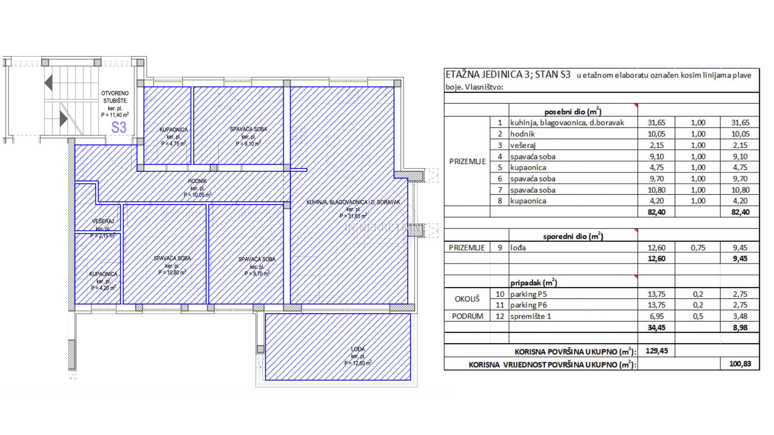 Die Gesamtbodenfläche beträgt 129,45 m², während die gesamt nutzbare Wohnfläche der Wohnung 100,83 m² umfasst.
