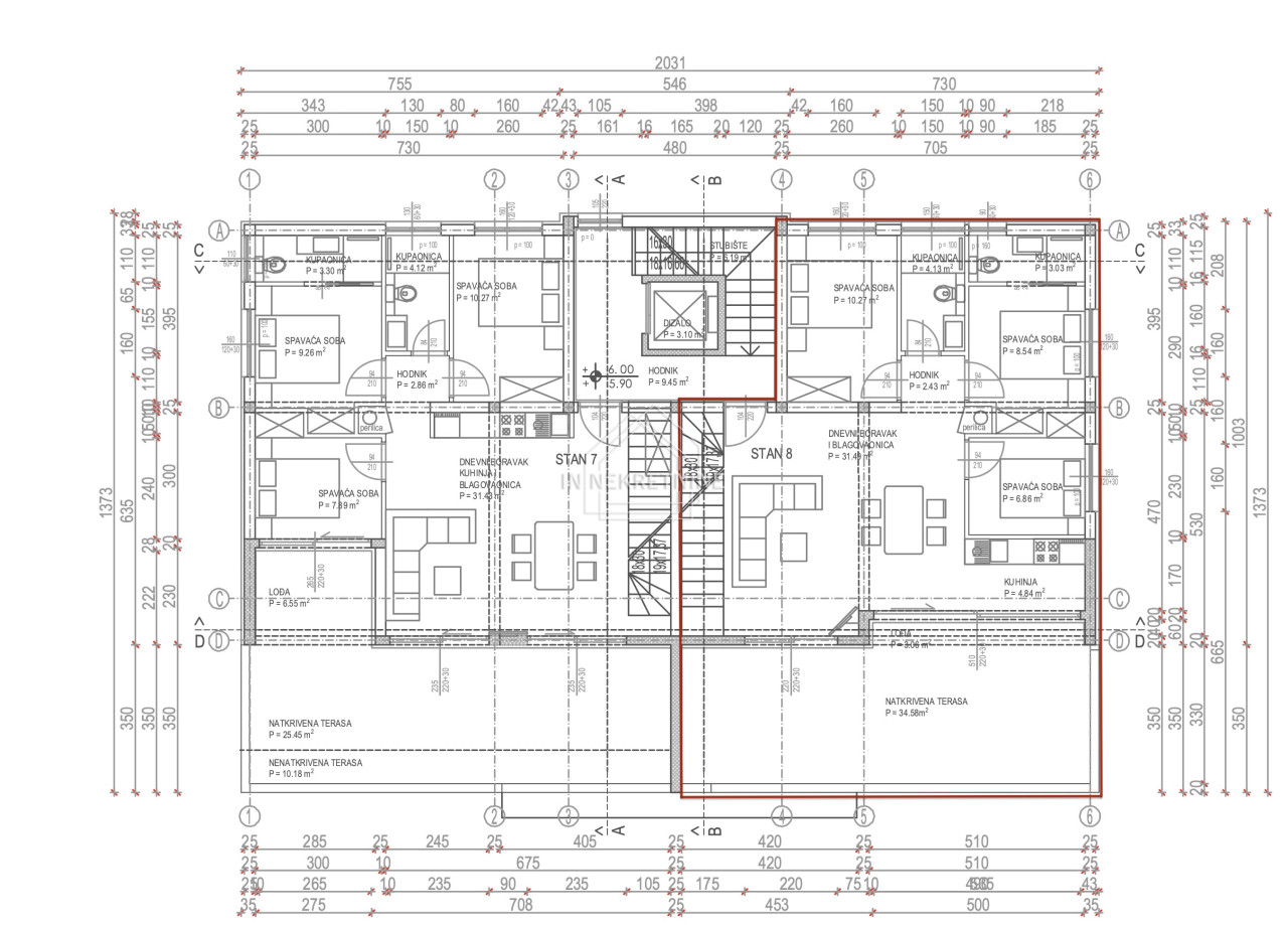 Das Penthouse besteht aus einer Küche mit 4,84 m², einem großzügigen Wohn- und Essbereich mit 31,49 m² sowie drei Schlafzimmern, von denen eines 6,86 m², ein weiteres 10,27 m² misst, während das dritte Schlafzimmer mit 8,54 m² über ein eigenes Badezimmer mit 3,03 m² verfügt. Zusätzlich stehen ein weiteres Badezimmer mit 4,13 m², ein Flur mit 2,43 m², eine interne Treppe mit 7,19 m² sowie eine großzügige überdachte Terrasse mit 34,58 m² zur Verfügung, ideal für den Aufenthalt im Freien das ganze Jahr über.