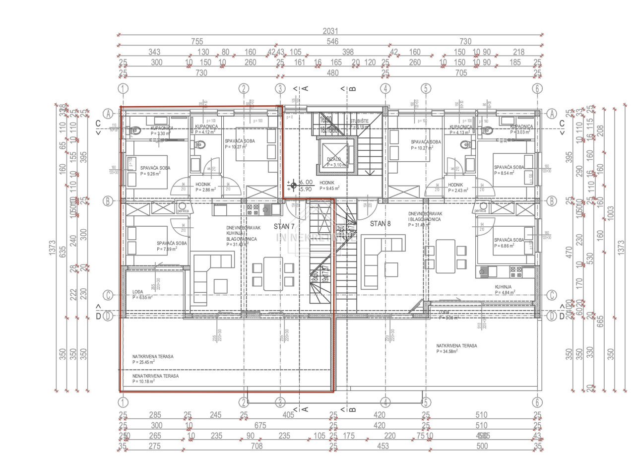Das Penthouse besteht aus einer Küche, einem großzügigen Wohn- und Essbereich mit 31,43 m² sowie drei Schlafzimmern. Ein Schlafzimmer misst 7,89 m², ein weiteres 10,27 m², während das dritte Schlafzimmer mit 9,26 m²über ein eigenes Badezimmer mit 3,03 m² verfügt. Zusätzlich stehen ein weiteres Badezimmer mit 4,12 m², ein Flur mit 2,86 m², eine interne Treppe mit 7,19 m² sowie eine überdachte Terrasse mit 25,45 m², eine offene Terrasse mit 10,18 m² und eine Loggia mit 6,55 m² zur Verfügung – ideal für den Aufenthalt im Freien das ganze Jahr über.