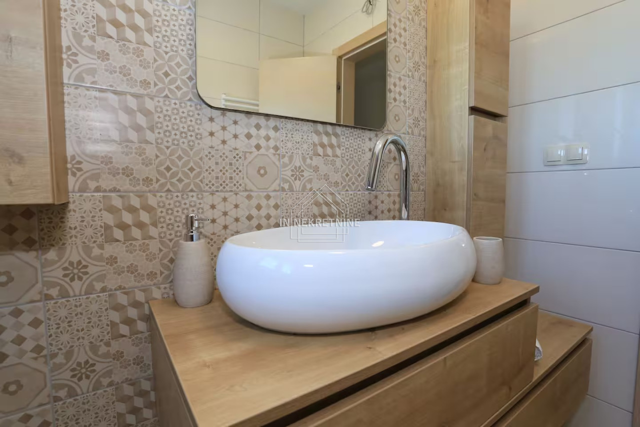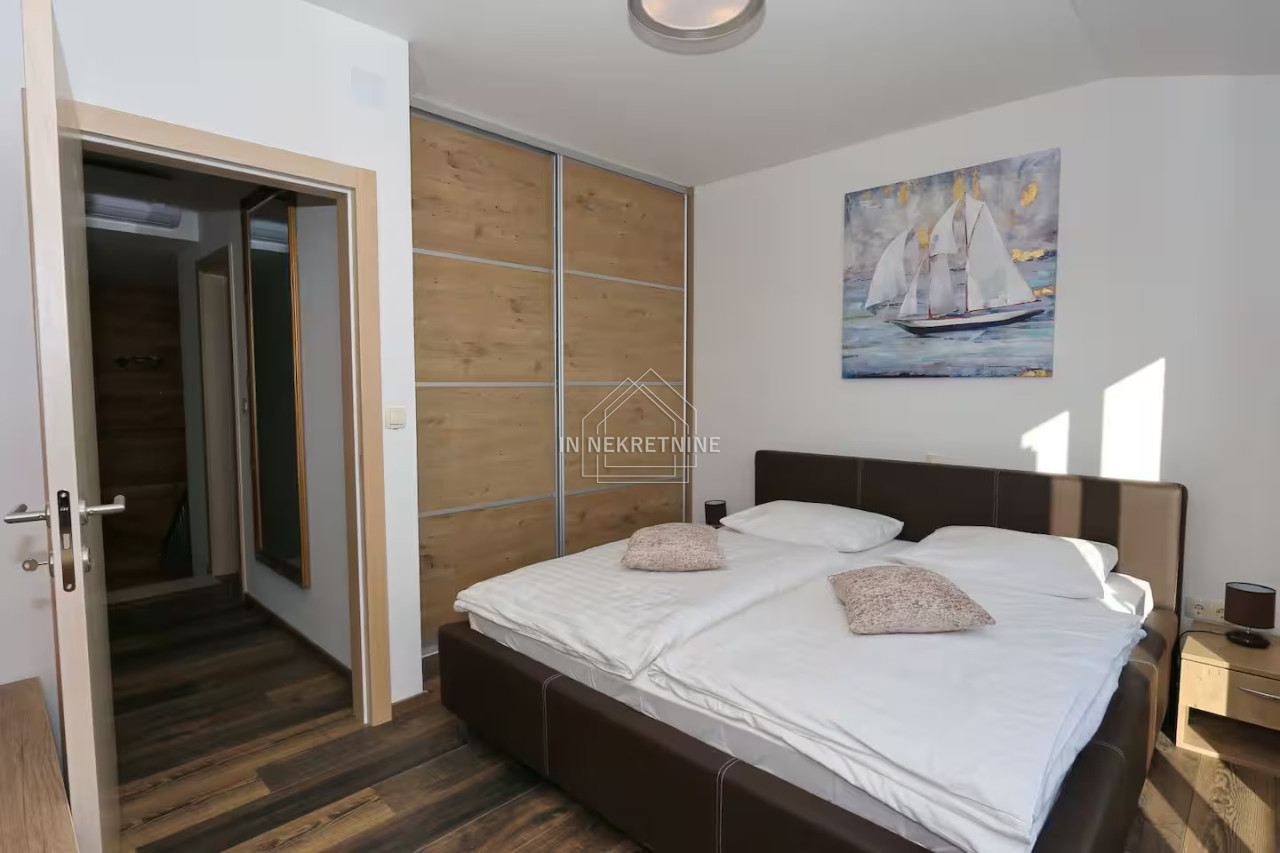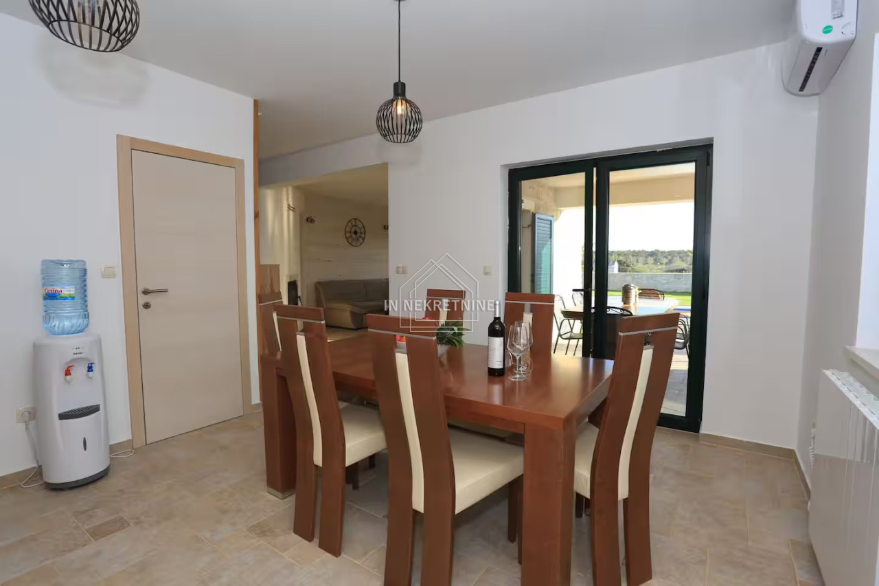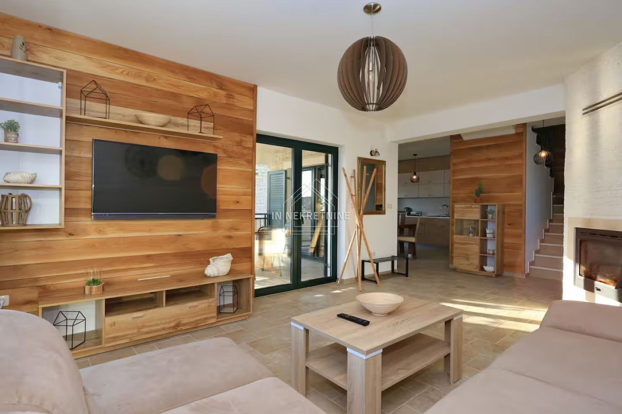 The beautifully landscaped garden features a swimming pool of 18 m², perfect for relaxation and enjoying the Mediterranean climate. The house is sold fully furnished, as shown in the photos, allowing for immediate move-in or continuation of tourist rental without additional investment.