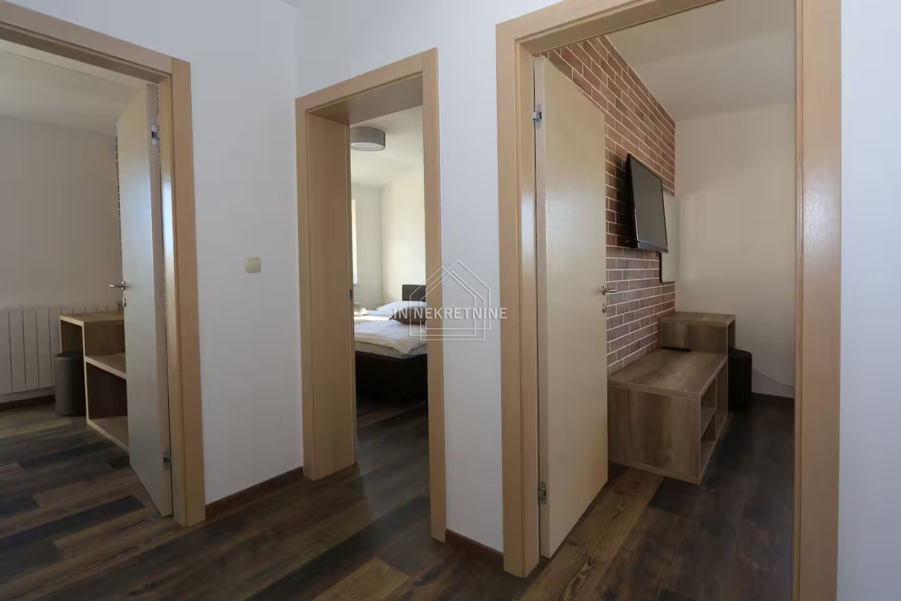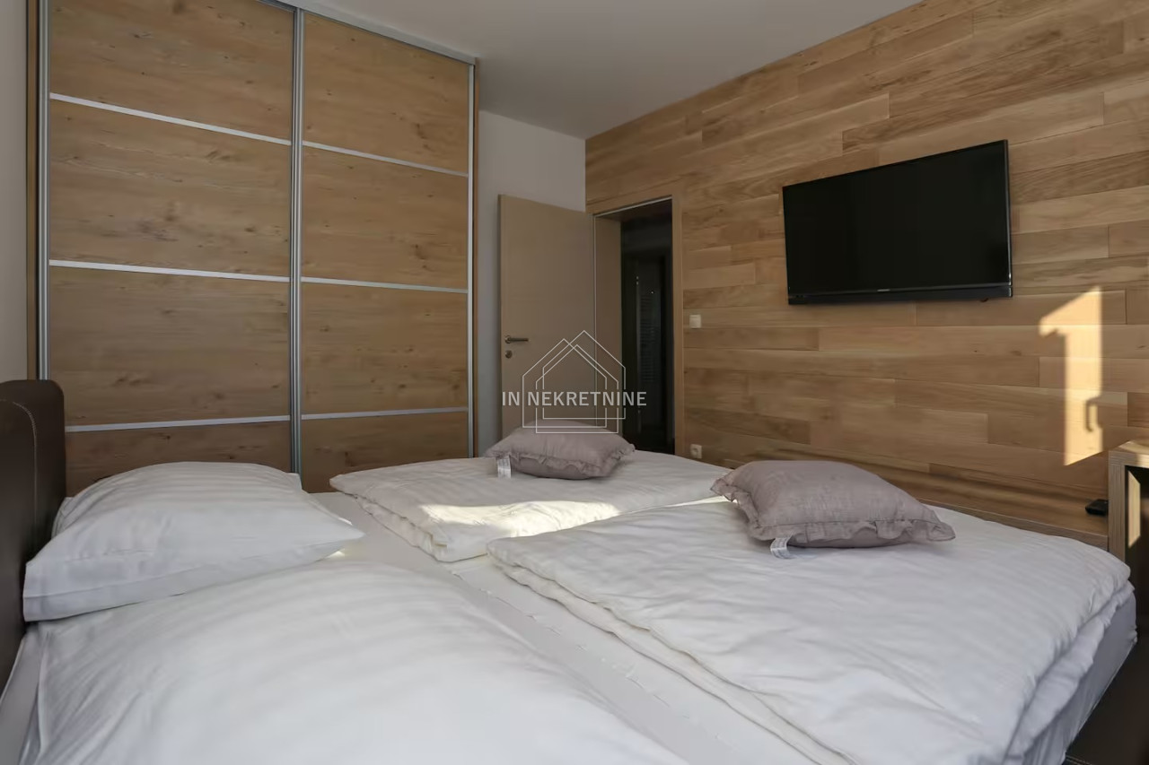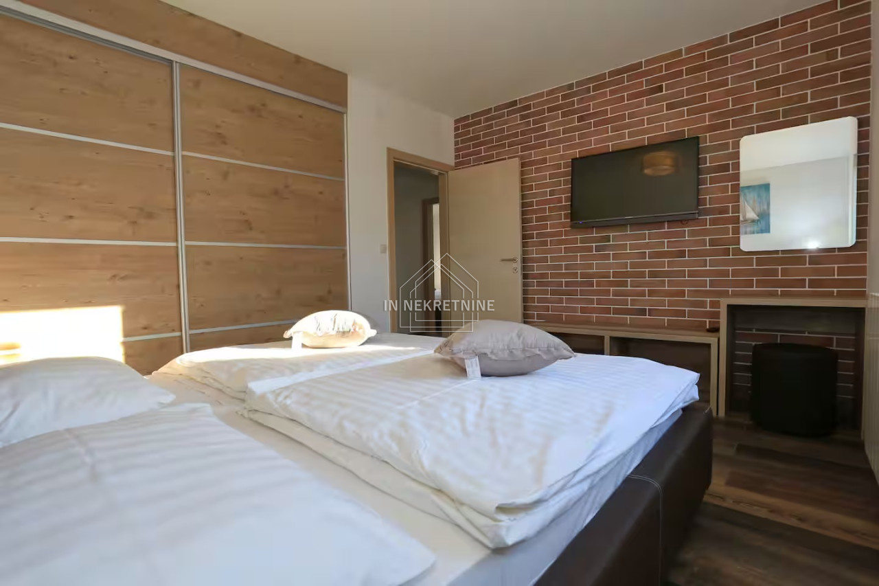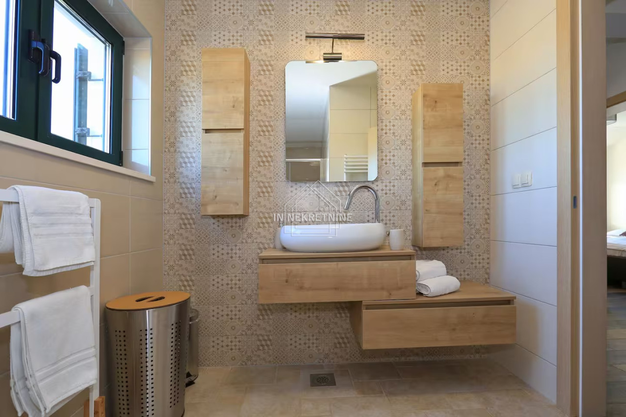The beautifully landscaped garden features a swimming pool of 18 m², perfect for relaxation and enjoying the Mediterranean climate. The house is sold fully furnished, as shown in the photos, allowing for immediate move-in or continuation of tourist rental without additional investment.