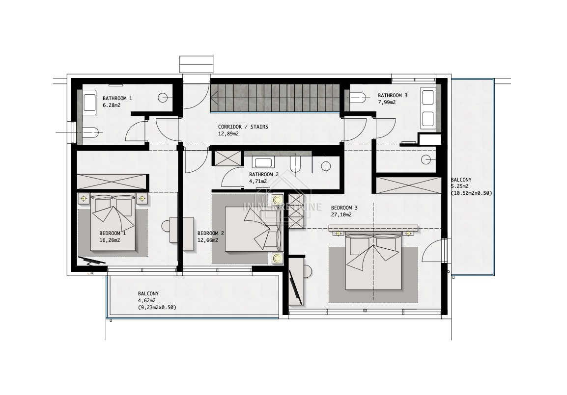 The villa features three comfortable bedrooms, three modern bathrooms, and an additional guest toilet, ensuring maximum comfort and functionality.