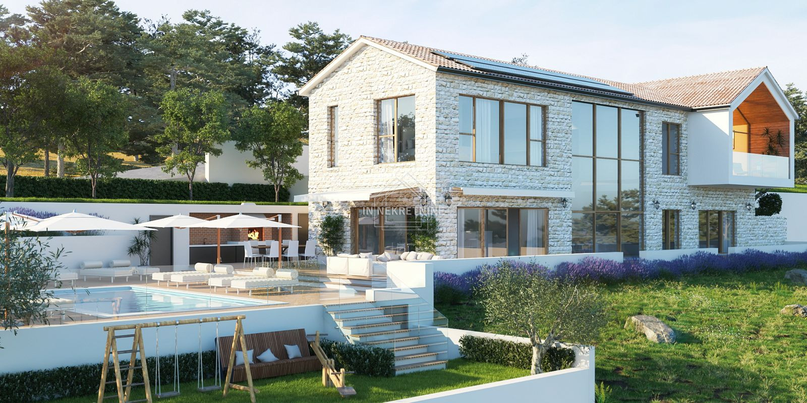 The representative pool area with spacious terraces transforms the property into a private oasis. Surrounded by Mediterranean landscaping and stylish lounge areas, the villa offers a truly exclusive atmosphere with an authentic holiday feeling.
