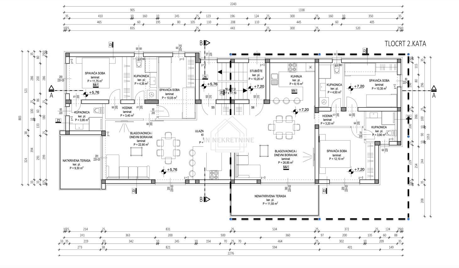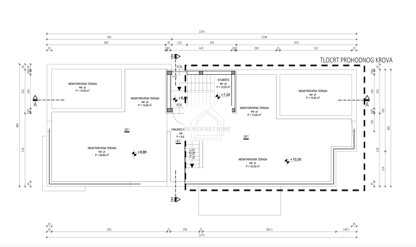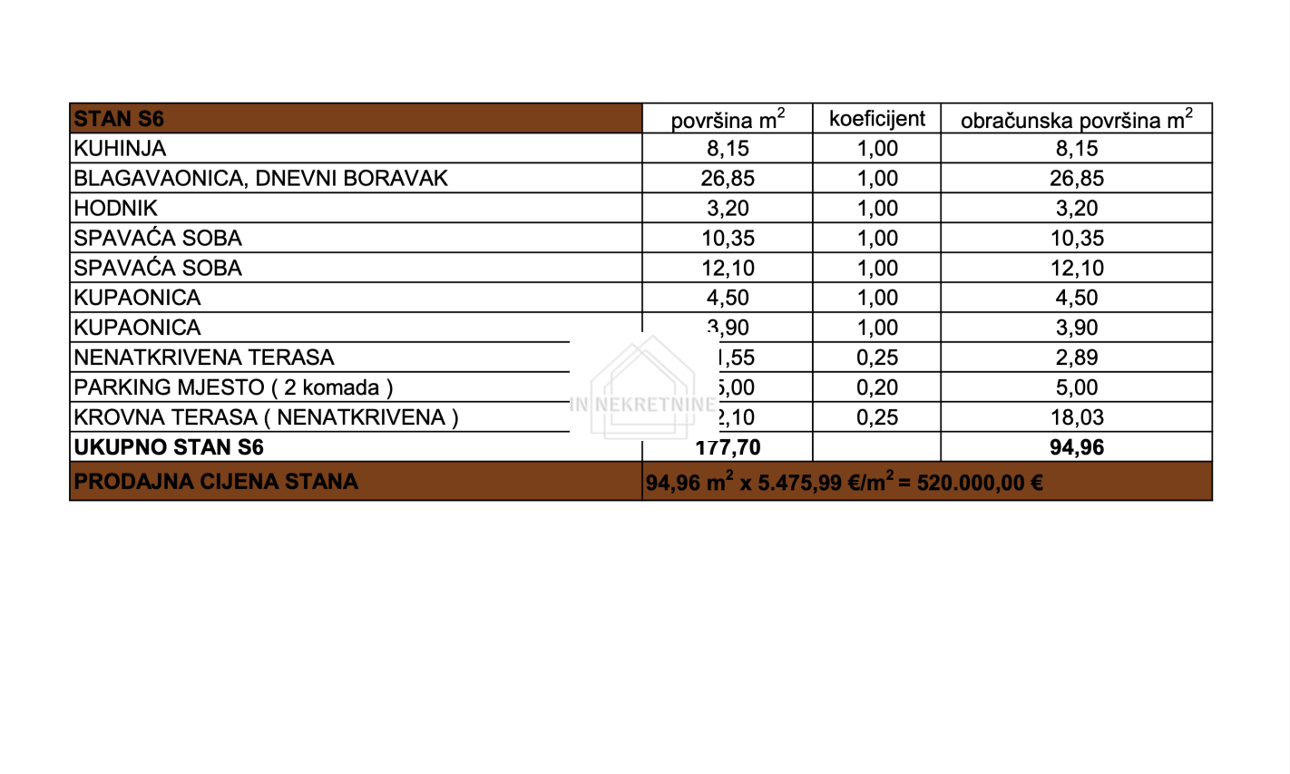 Stan se nalazi na drugom katu zgrade i ima vlastitu krovnu terasu s bazenom, s koje se pruža prekrasan pogled na more. Stan se prostire na 177,70 m² bruto površine, dok korisna površina iznosi 94,96 m².