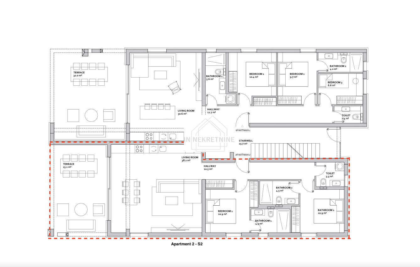 Sastoji se od prostrane kuhinje s blagovaonicom i dnevnim boravkom, dvije spavaće sobe svaka s vlastitom kupaonicom, odvojenog WC-a i hodnika. Iz dnevnog boravka se izlazi na natkrivenu lođu koja vodi u veliki privatni vrt s infinity bazenom, ljetnom kuhinjom i vanjskim tušem – savršeno za uživanje tijekom toplih mediteranskih dana.