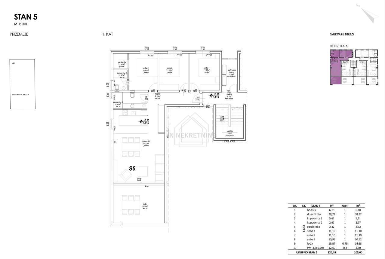 Stan se nalazi na prvom katu i ima neto korisnu površinu od 105,60 m², a sastoji se od:
