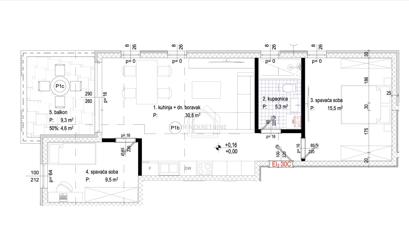 Ukupna neto površina stana s pripadcima je 76,97 m².